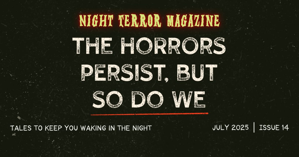 Today, July 4th, we release our latest issue of Night Terror Magazine, which also marks one full year since we launched this project. We want to celebrate, but to share our utmost honesty, our team carries grief that makes celebrating feel complicated. Still, this past year has been filled with incredible growth, connections we never imagined, and opportunities to uplift underrepresented voices in horror. Even in these heavy times, we want to remind you that we persist too.