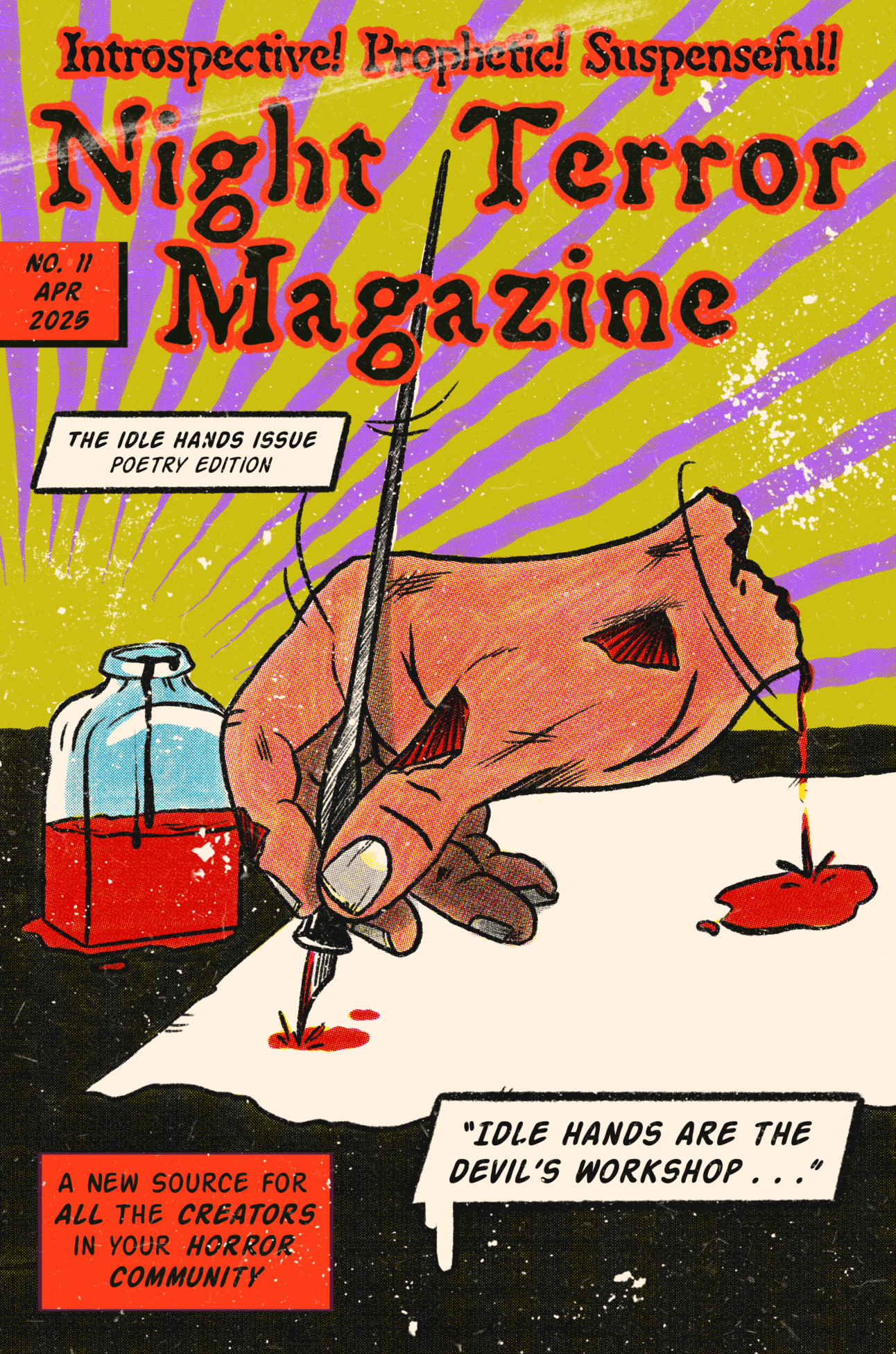 When we read a horror novel, we commit to a gradual build…a prose that incites fear and tension over time. But with poetry, we open ourselves to an instant unsettling. It speaks through the unsaid. The imagery and rhythm that poetry creates make it the perfect vessel for horror stories. NIGHT TERROR MAGAZINE ISSUE 11 IS OUT NOW!! Introducing IDLE HANDS: THE POETRY ISSUE!